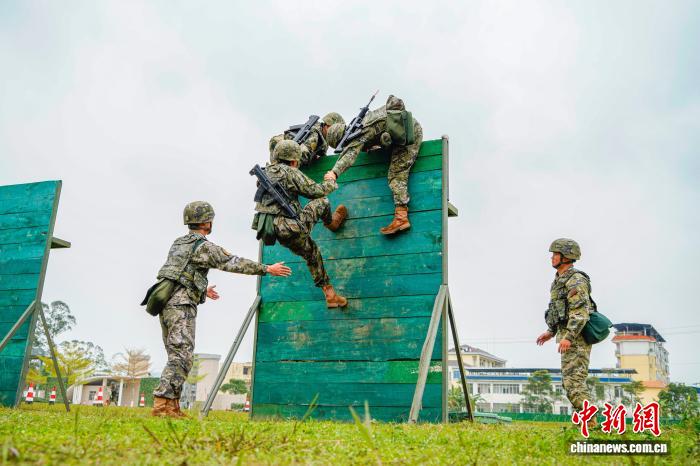 图为参训民卒正正在停止3人合作登攀考试。孔凡是泽 摄